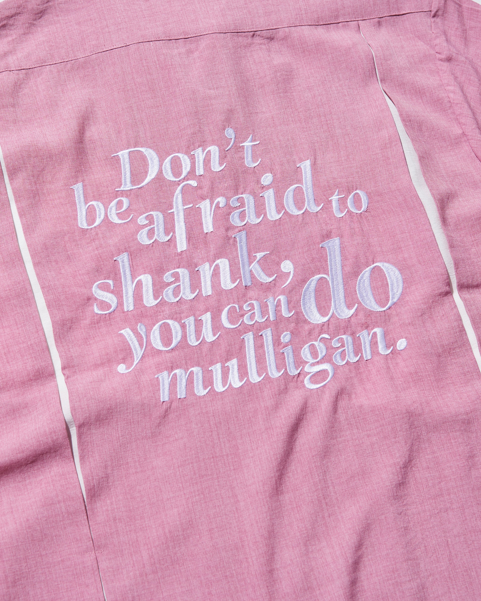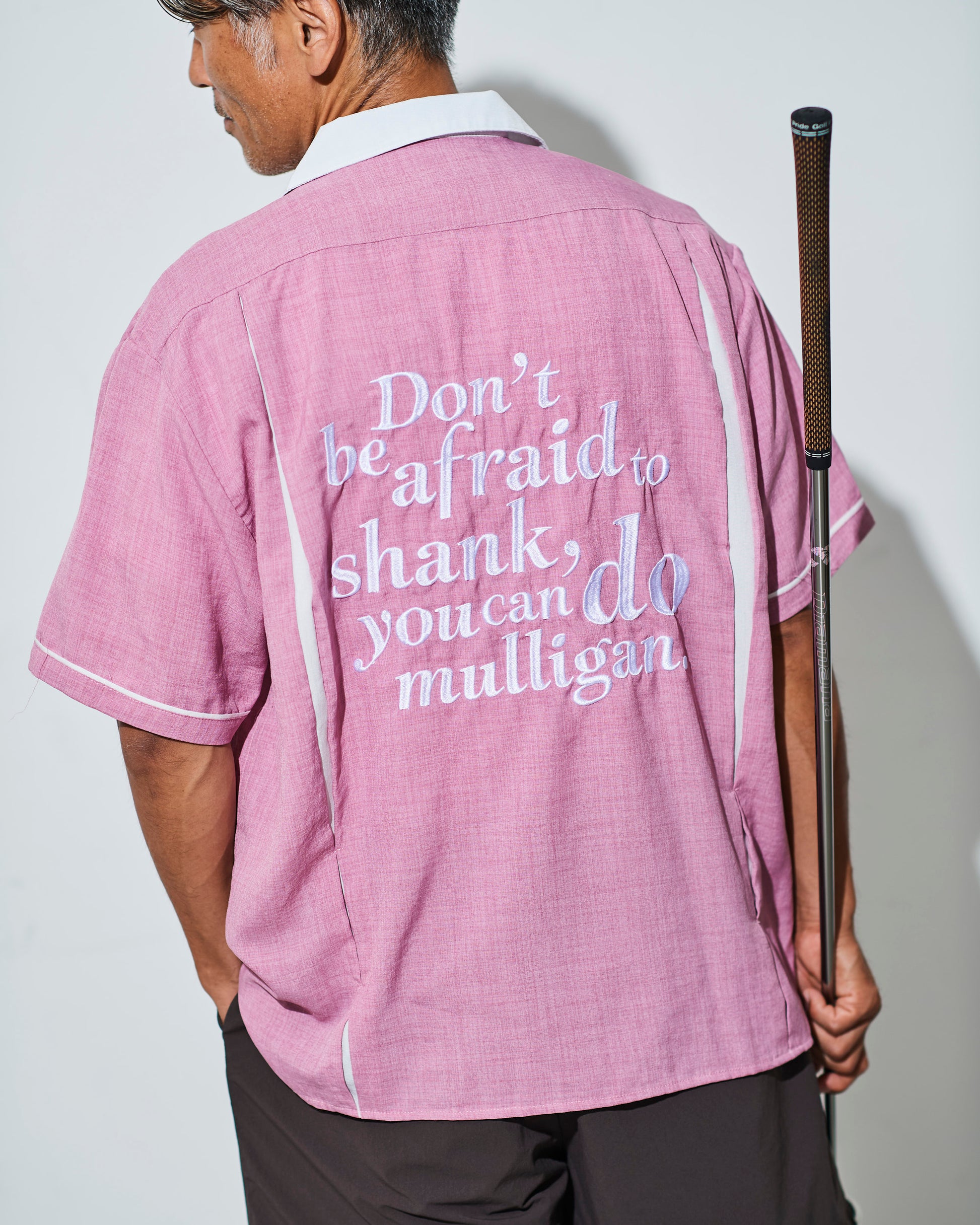 "ボーリング"からインスピレーションを得た開襟シャツは、背中の贅沢な刺繍、クレリックカラー、パイピングなど、ならではのアイコニックなディテールが特徴です。ポリエステル100%なので洗濯してもシワにならず、サラリとした肌触りは炎天下でも快適にラウンドしていただけます。